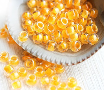 These unusual Czech glass ovals from Maya Honey definitely look like they’re made with tasty flavors, with a mix like rock candy or salt water taffy. The pink patina even adds an additional layer of frosted appeal. I’d definitely want to pair these treats with some luminous orange-lined seed beads for an extra pop of color to bring everything together. This shade is a near-perfect match for the filling in fondant eggs. I think the combination would be great in a chunky multistrand necklace.