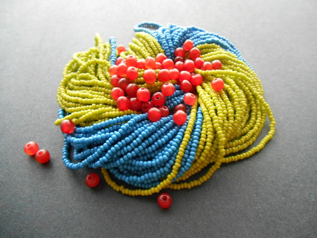 Red horn rounds were up next, and although I have used these beads a bit, I like them too much to see the last of them go until the perfect palette comes along. The slightly translucent finish and deep color are a perfect match for the seed beads, not to mention a lot more versatile than the chunky shell chips. I think Juniper Berry would be perfect for just about any project, but I’d love to use it in a collar or a patterned rope necklace.